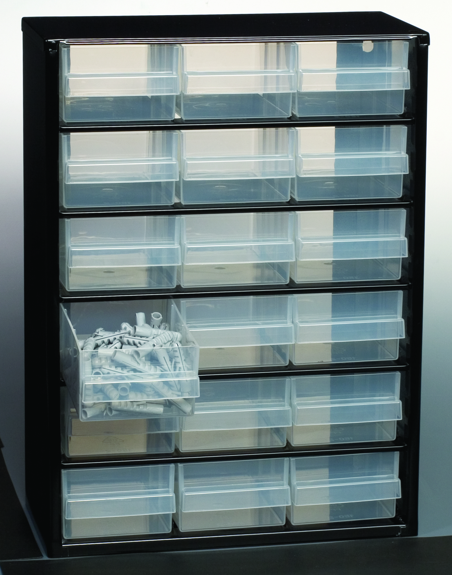 1. Er fremstillet af lakeret stål, og skufferne er af slidstærkt , transparent plast (PP) og gør det nemt at identificere indholdet.
