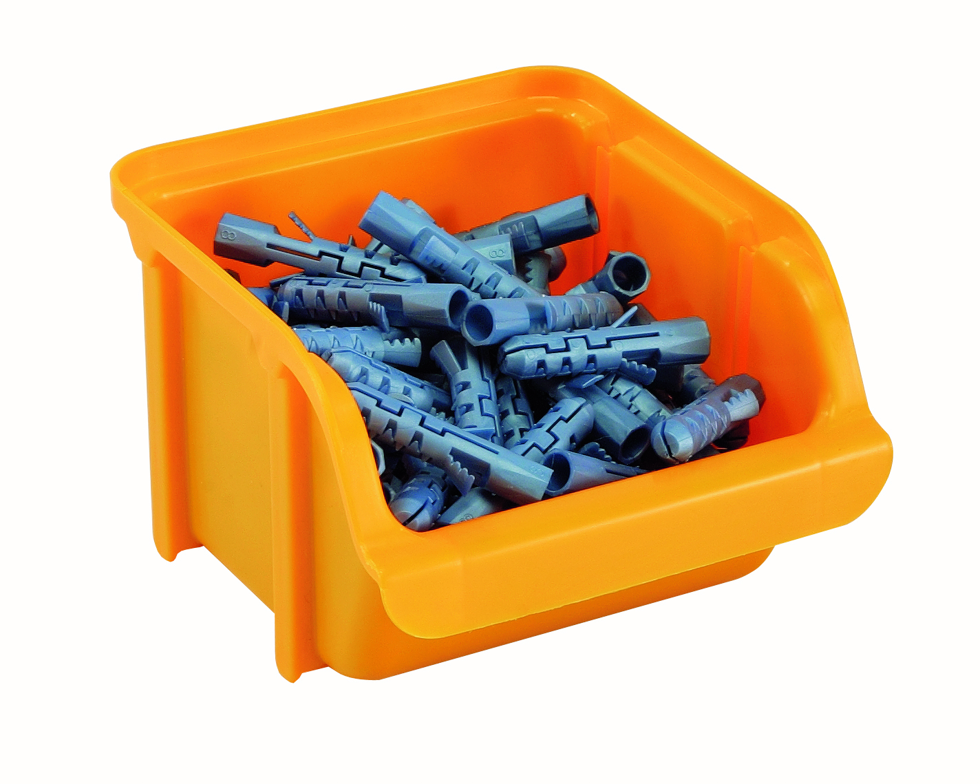 Sichtlagerkasten Größe 1, gelb. Stapelbar. Kann in Wandschiene (Zubehör) eingehängt werden.