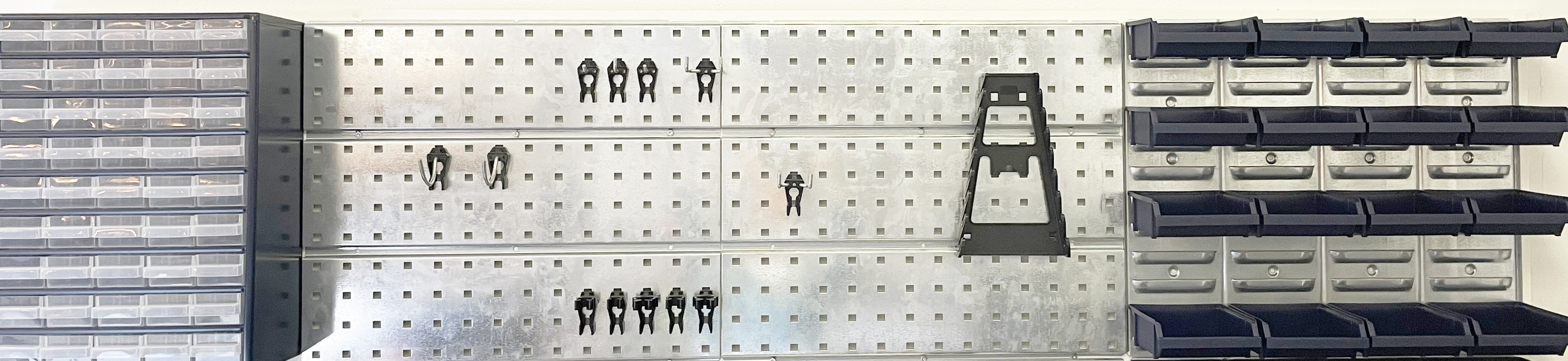 Starter Set mit 2 Lochwänden, einem 22teiligen Clipsortiment*, einem Stahlmagazin 928-123 mit 28 Schubladen sowie einem Schlitzpaneel mit 16 Sichtboxen Typ 2-80 - die optimale Grundausstattung für den Heimwerker