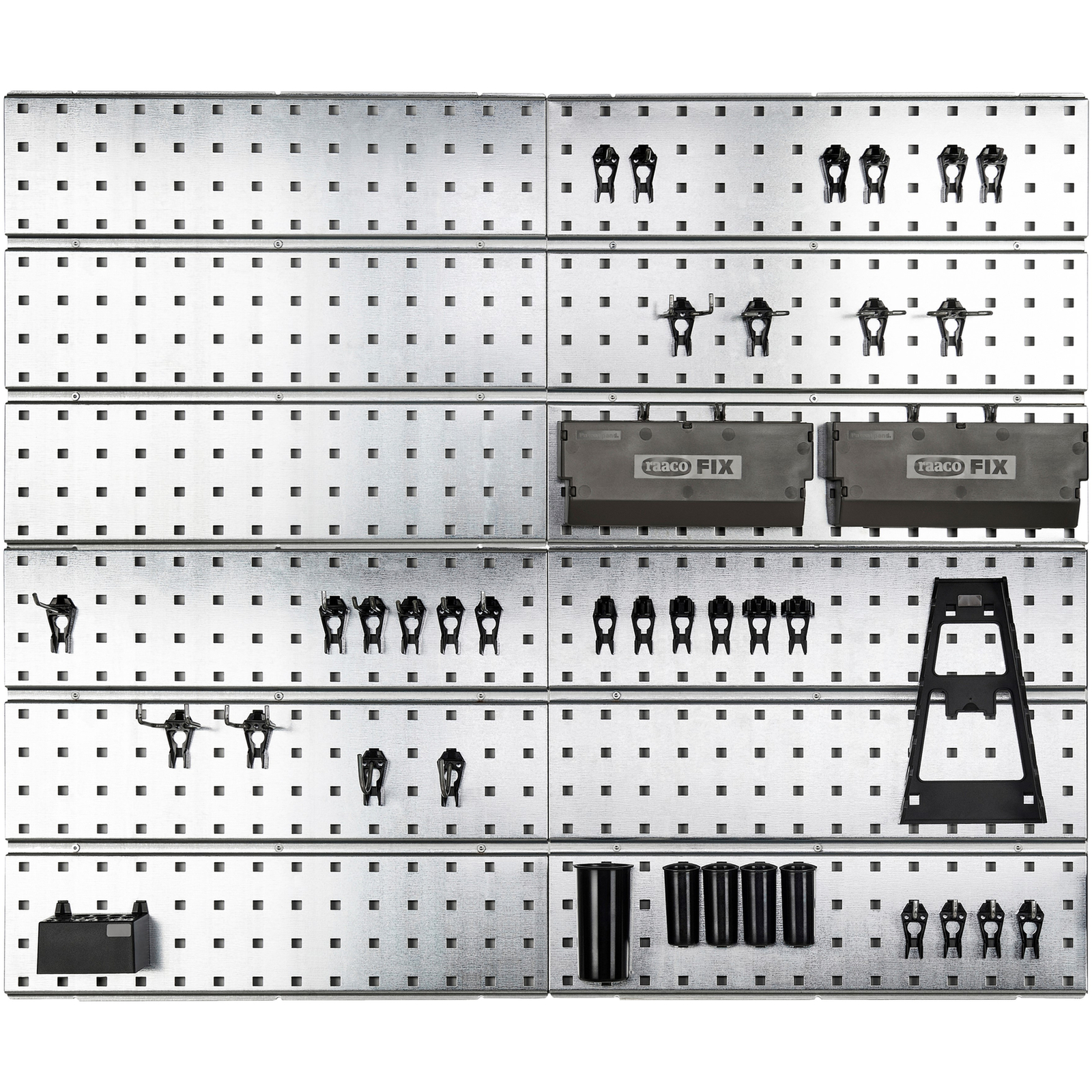 4 Lochplatten mit 2 raacoFix small und 38 sortierten SuperClip: 7 x 1-30, 1 x 1-60, 1 x 1-90, 1 x 2-30, 1 x 2-60, 4 x 3-25, 2 x 3-50, 2 x 4-40, 1 x 4-50, 2 x 5-17, 1 x 5-20, 2 x 6-12, 2 x 6-18, 2 x 6-24, 4 x 8-30, 1 x 8-50, 2 x Clip10, 1 x Clip11 og 1 x Clip12.