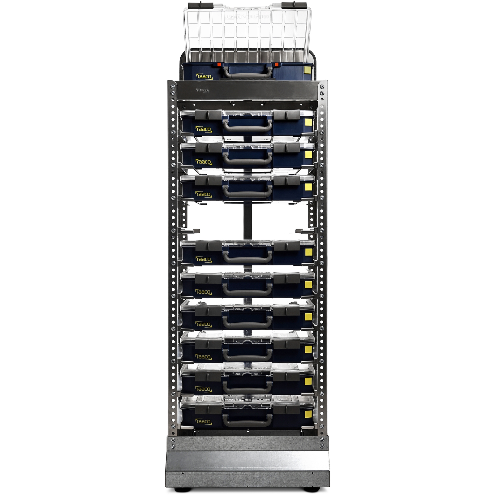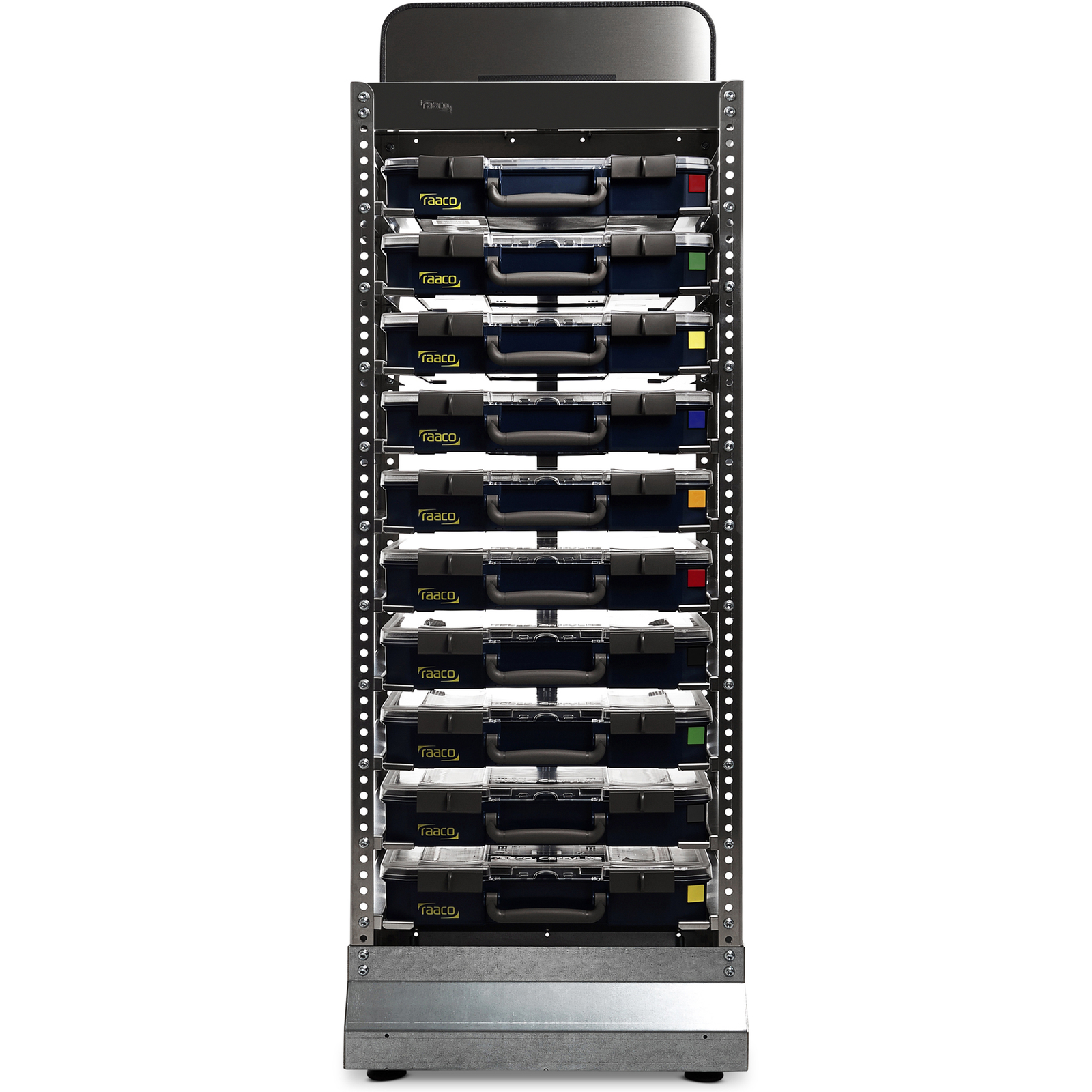 Depot, mit Platz für 10 CarryLite 5x10 Sortimentskoffer. Aufnahmen mit Stopprändern verhindern ein Herausrutschen der Koffer. Etikettenhalter für Beschriftungszwecke.