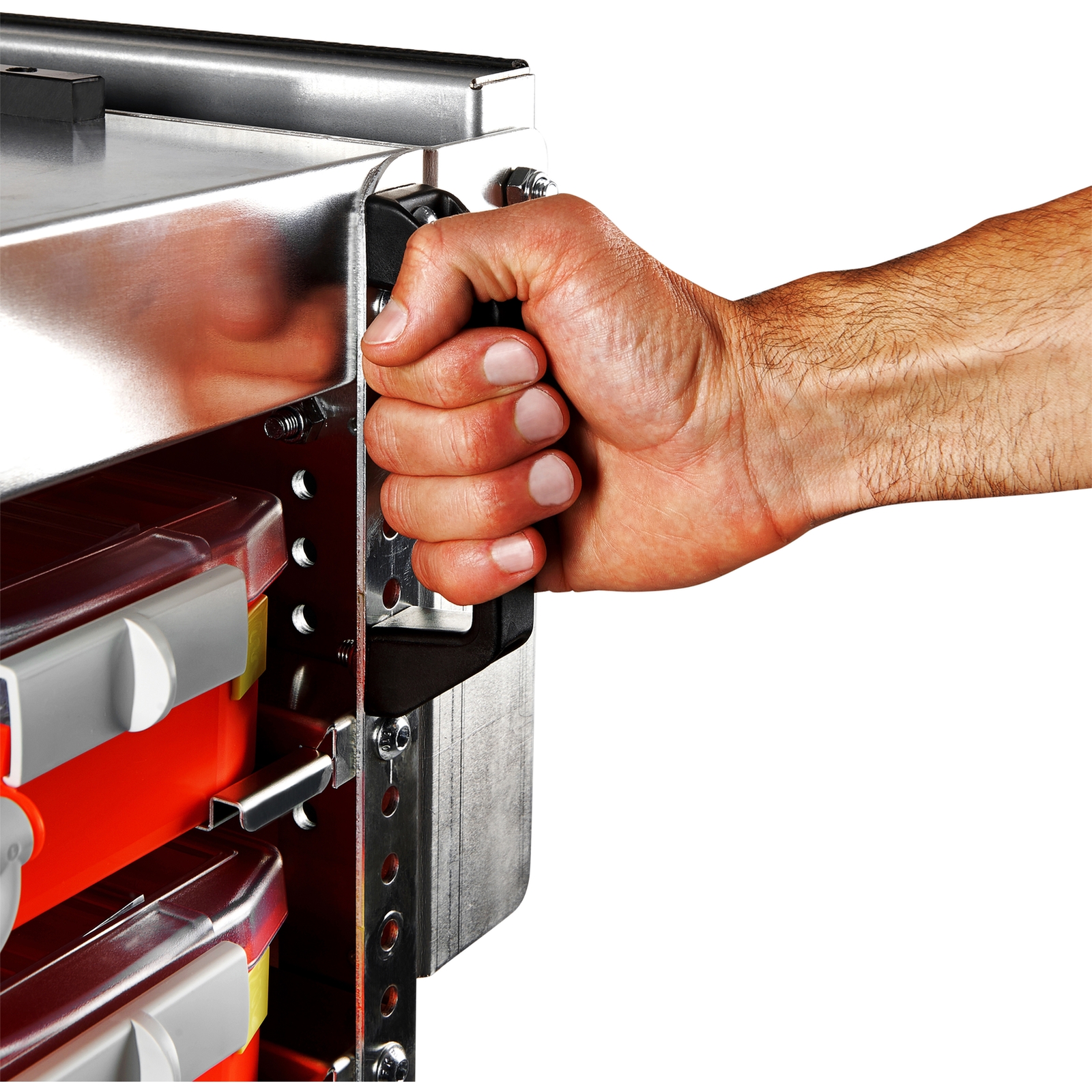 Trolley mit Platz für 7 CarryLite 5x10 Sortimentskoffer. Ausgestattet mit 2 klappbaren Seitenablagen zur Aufnahme von je einem CarryLite inkl. Magnetschloss zur Arretierung. Aufnahmen mit Stopprändern verhindern ein Herausrutschen der Koffer. Etikettenhalter für Beschriftungszwecke. Der Trolley verfügt über 4 Handgriffe für einfaches Manövrieren sowie Rollen mit 2 Feststellbremsen und Kantenschutz.