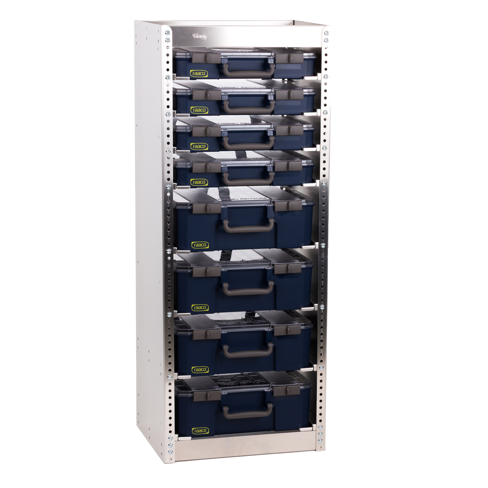CarryLite-Regal bestückt mit 8 CarryLite-Koffern. 4 Stück CarryLite 80 5x10-15 und 4 Stück CarryLite 150-9.