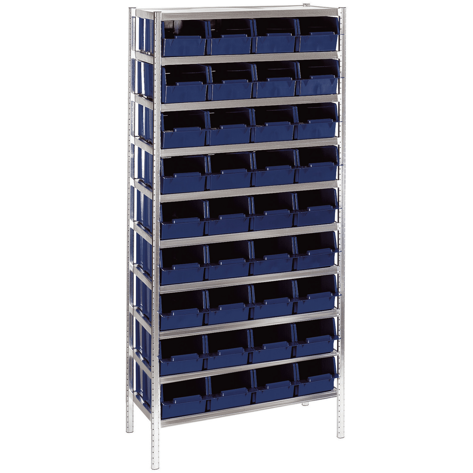 Schubladenregal bestehend aus 10 Stück Regalböden 90-40, 8 Stück Steckpfosten sowie 36 Stück Regalschubladen 7-1600.