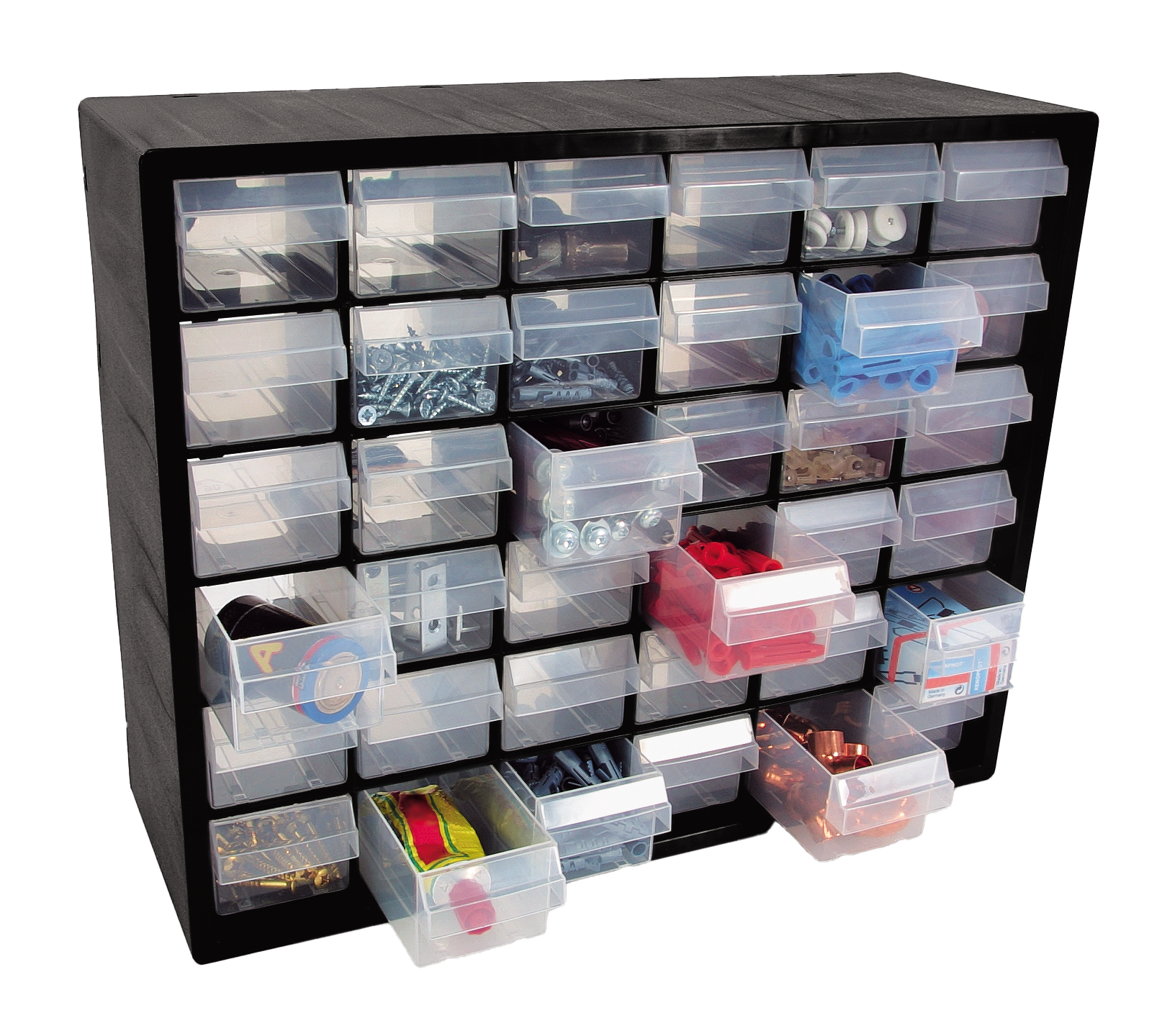 Robustes Kleinteilemagazin aus Kunststoff mit 36 Schubladen aus schlagfestem PP. Stehend oder hängend einsetzbar. Schubladen mit Trennwänden (als Zubehör erhältlich) unterteilbar.