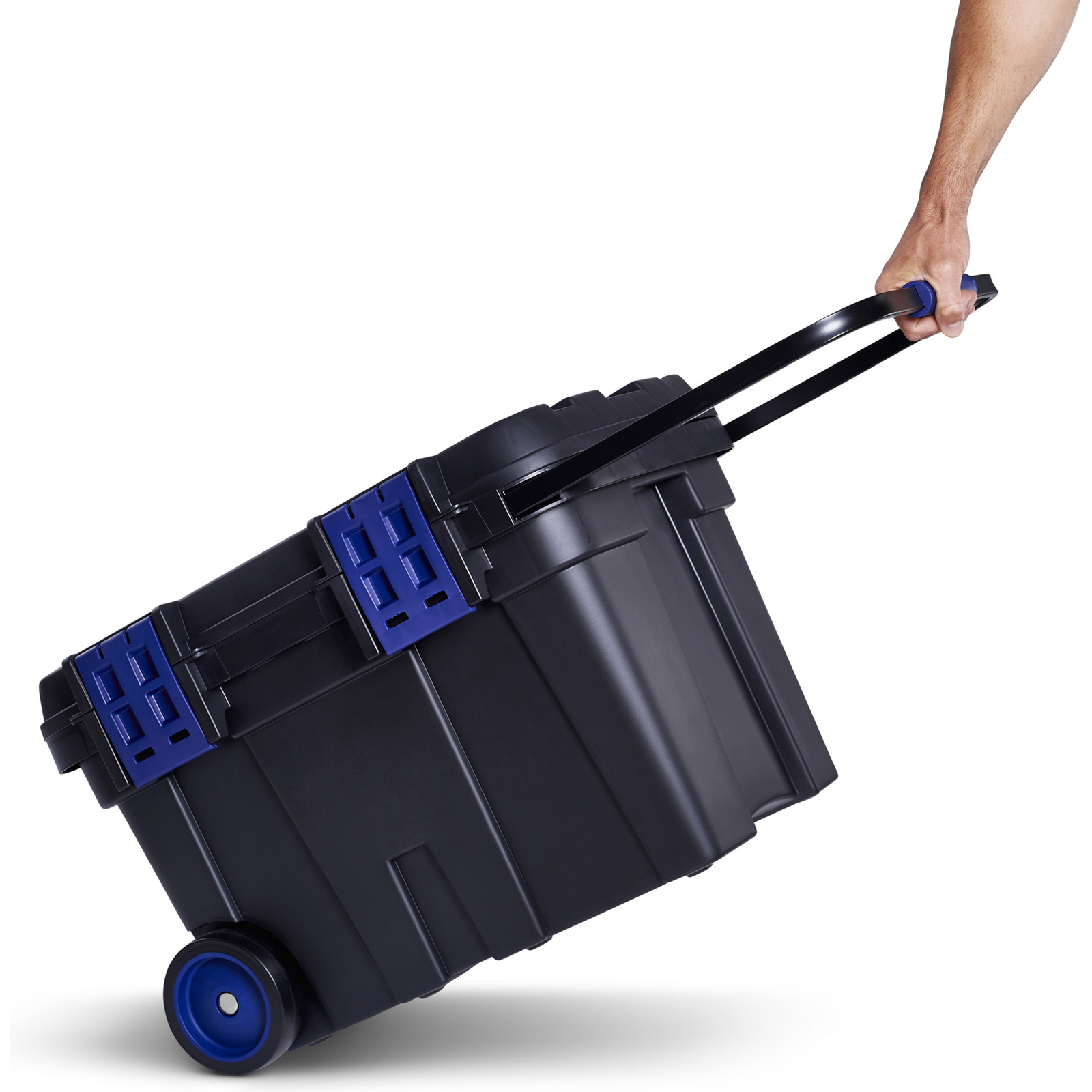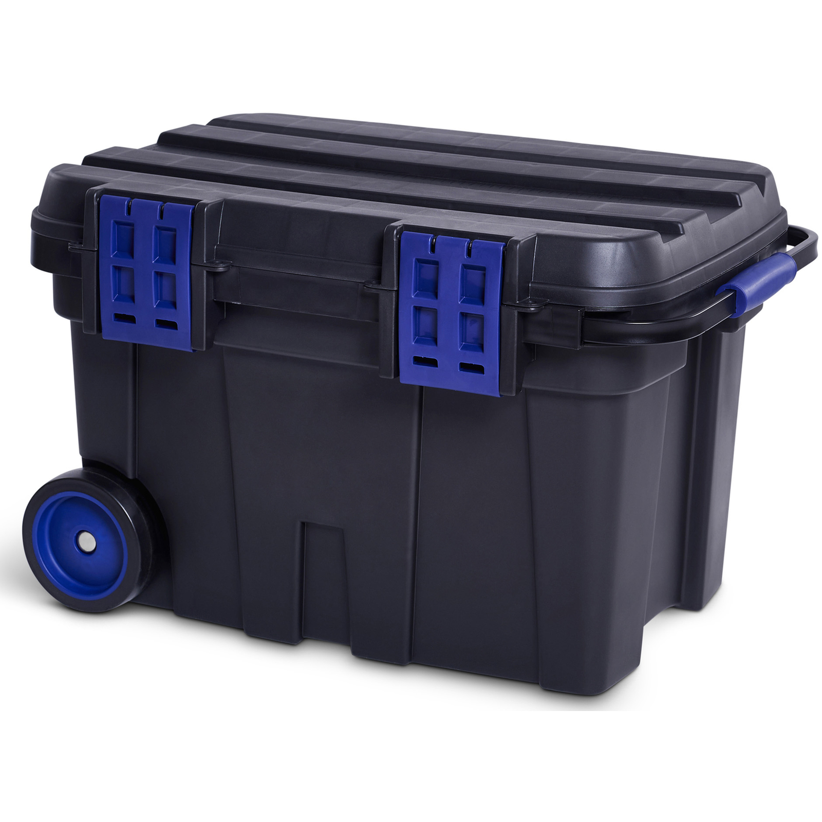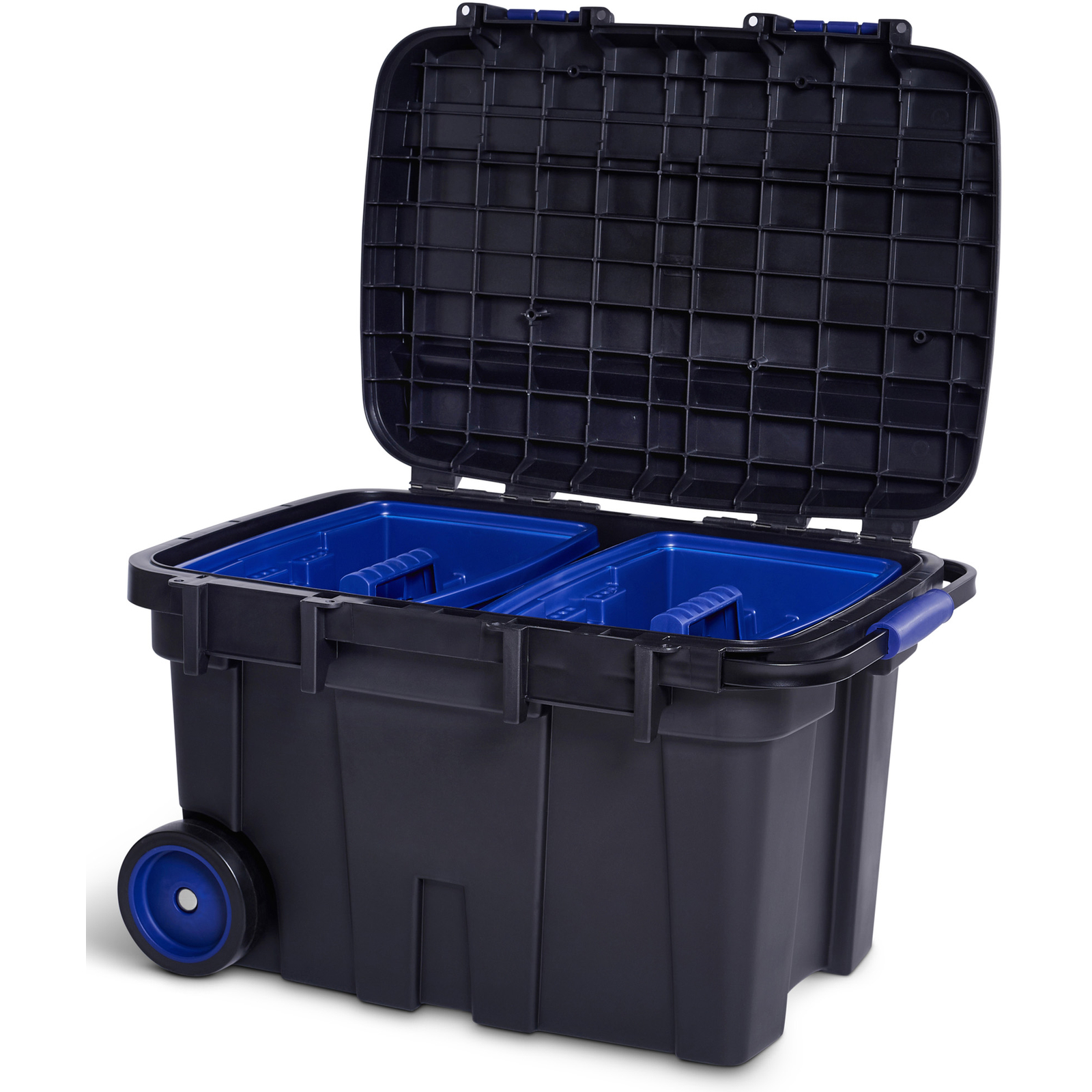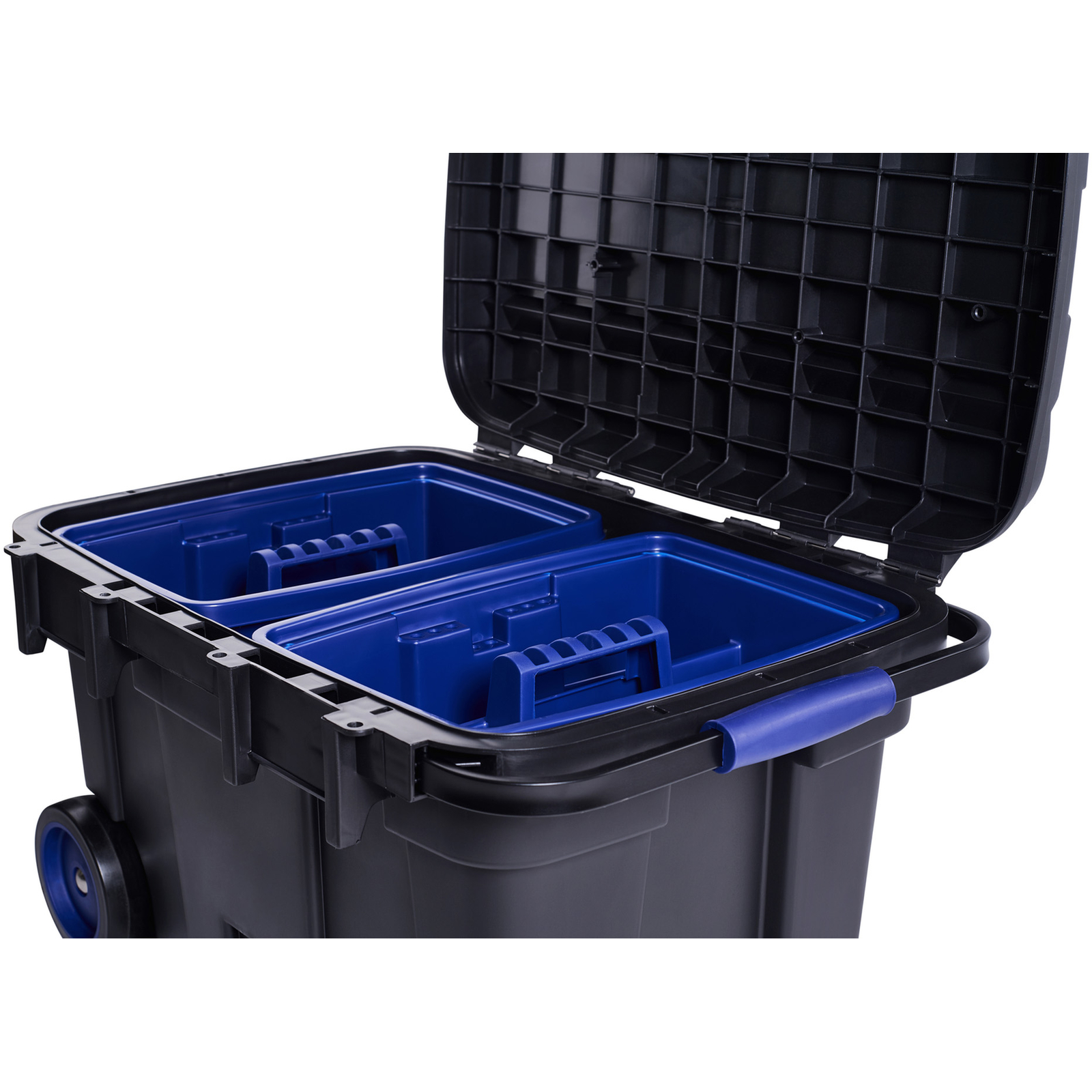 Coffre à outils à roulettes de grande capacité pour le stockage et le transport de gros outillage. Il est muni d'une poignée escamotable, de 2 plateaux et 2 loquets de fermeture. Il peut être cadenassé et le couvercle peut servir pour fixer des outils. Volume: 75 L.