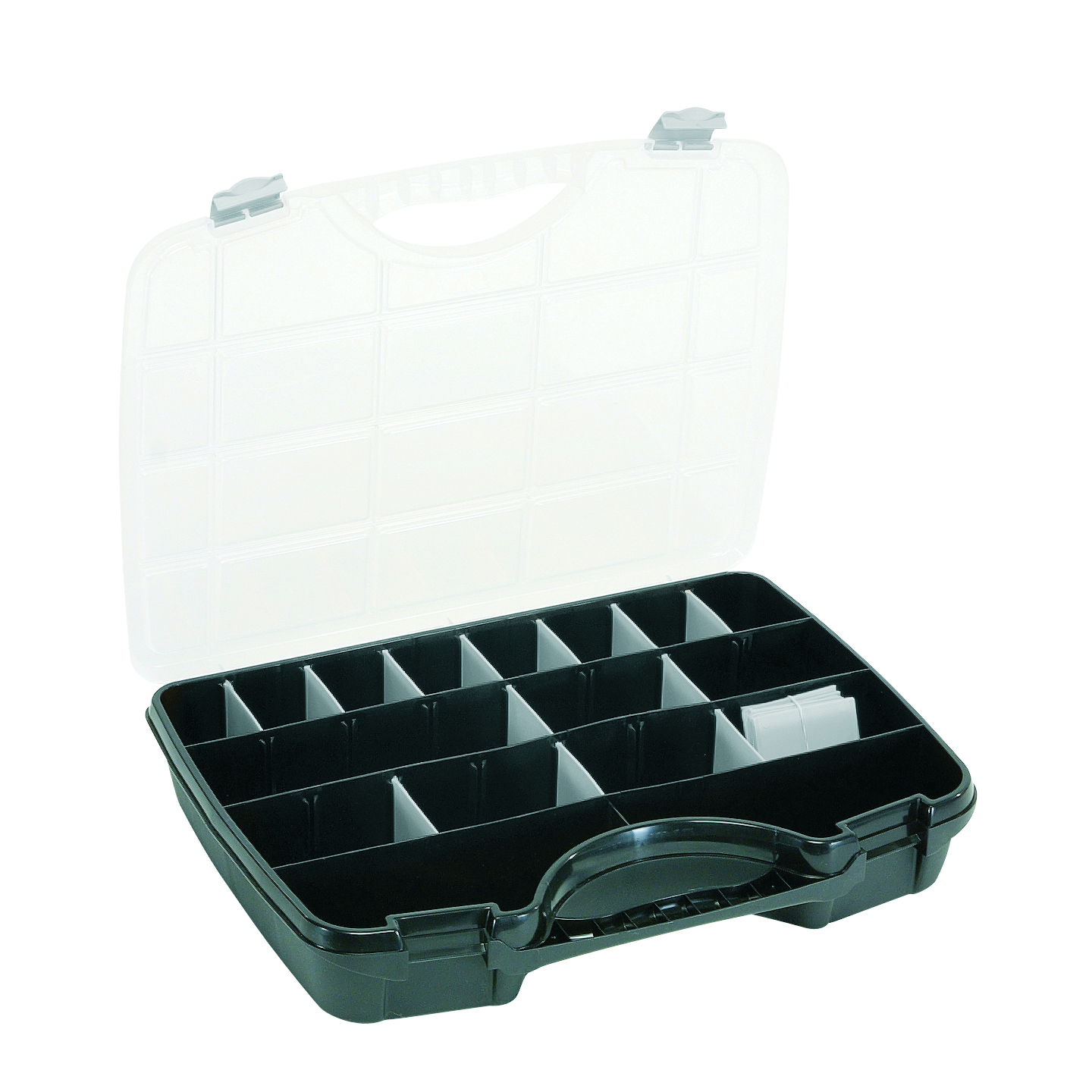 Mallette 46x35 cm avec 3 larges compartiments fixes et 21 séparateurs amovibles. Couvercle transparent. Fabriqué en polypropylène.